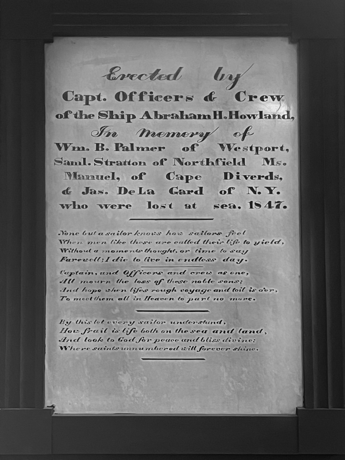 We’d like to take a look at some of the crew from the Abraham H. Howland Ship and it’s unique cenotaph. Note that even though the wording carved into the stone slab may imply these men shared the same fate, that is not the case. William B. Palmer, who was actually from Fairhaven not Westport, passed away in June 1846 though how exactly was not discovered. Samuel Stratton from Northfield Massachusetts was killed by a whale in May of 1847 in the Sea of Japan. James DeLaGardi from New York had little to no recorded information of his death other than he was lost on the passage home. Lastly the name “Manuel” was not listed as one of the crew members however many speculate he was most likely recruited from the Cape Verde Islands. Given the resources available at their time, it is understandable how specific information from the past may be unattainable and leaves us with what we have. Though we may never know the full truth of what occurred, we can still attest that these brave men died for their communities and contributed to shaping our city as we know it today.