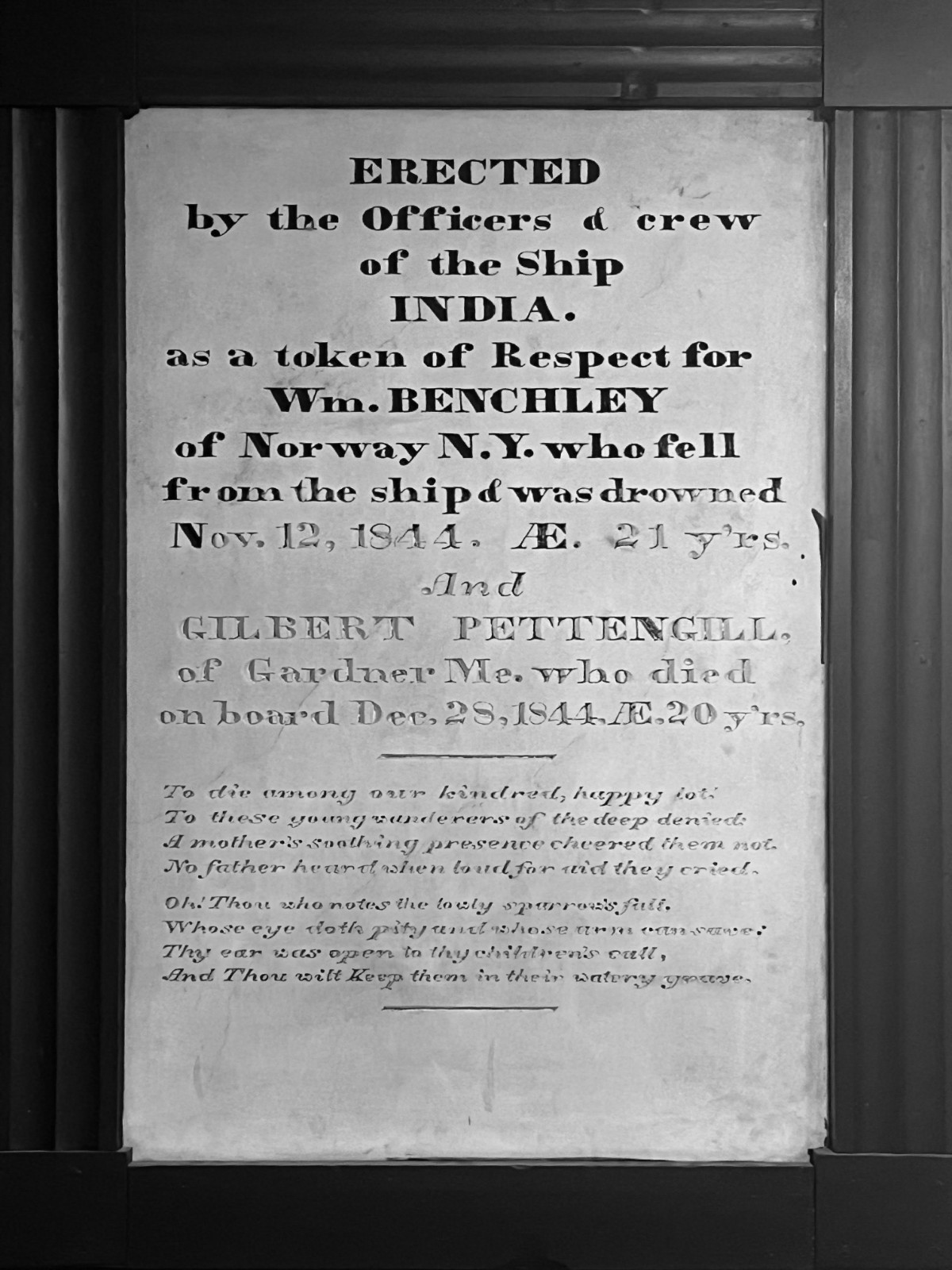 Just a month prior, tragedy had struck the crew of the India as well. On November 12th of 1844, another crewmember was unfortunately lost. The cenotaph reads the name “William Benchley” however there was no name listed amongst the crew. There was a William Beasley though who was twenty-one years old and another greenhand from New York. Sadly, William and the India were sailing in the Atlantic Ocean near the Cape Verde Islands when he fell overboard. The weather and sea at the time proved to be too much and unfortunately William was unrecoverable. Thus with heavy hearts, the India traveled back eventually and a cenotaph was erected in both Gilbert and William’s names.