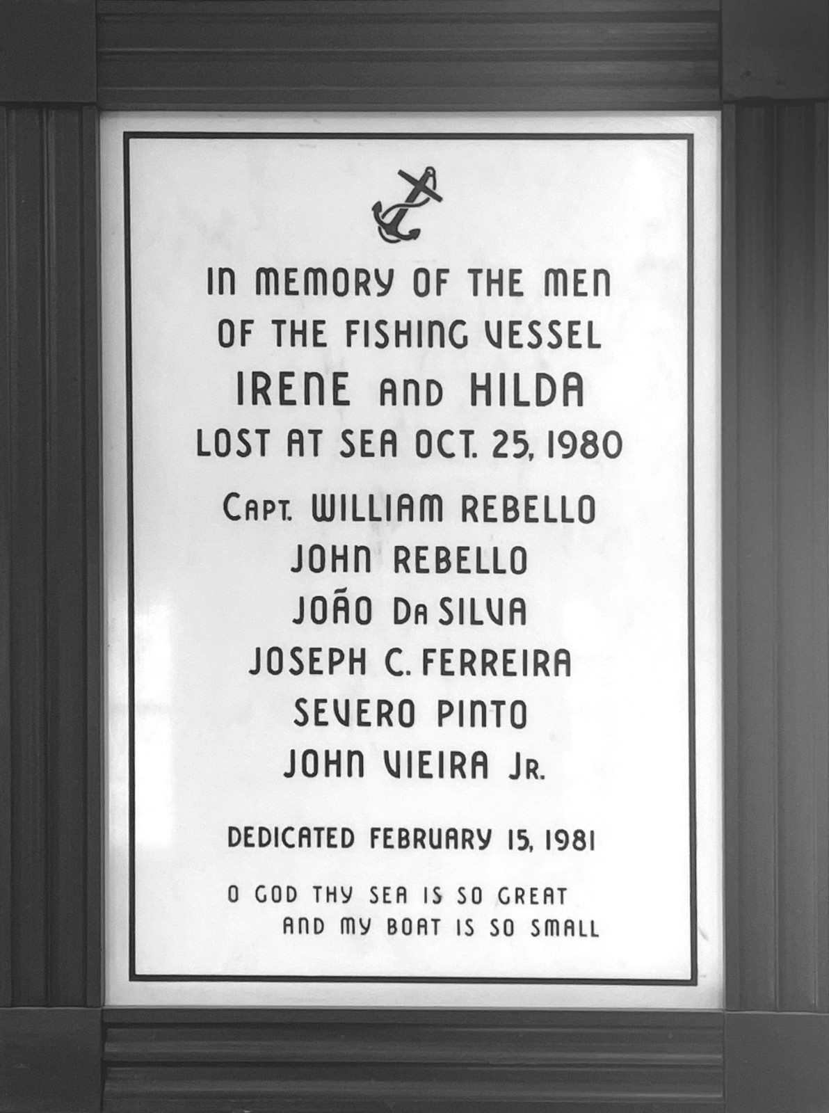 We’d like to honor the crew of the steel-hulled trawler known as Irene and Hilda. The vessel went out on October 25th in 1980 and was headed towards Georges Bank when twenty foot waves and sixty knot winds were encountered. Captain Rebello judged the conditions were too treacherous and decided to trek back home. At that time, John Rebello called his mother and informed her that the vessel would be arriving in New Bedford early Sunday morning. When the Irene and Hilda never returned though, Mrs. Rebello alerted the Coast Guard and a search began. For the three day investigation, the only evidence that could be found were barrels floating in the water on Monday and a life preserver on Wednesday. It appeared that the vessel would be lost to time, that is until August of 1982 when divers who were searching for a different wreck discovered her. Due to the meticulousness of the procedure, the extraction of the remains couldn’t have begun until October that same year. Sadly only John Rebello’s remains were found but shortly afterwards a cenotaph was constructed in the entire crew’s memory. Though no grave or service could ever replace those courageous individuals, we still continue to honor their legacy and never forget the sacrifices they made.