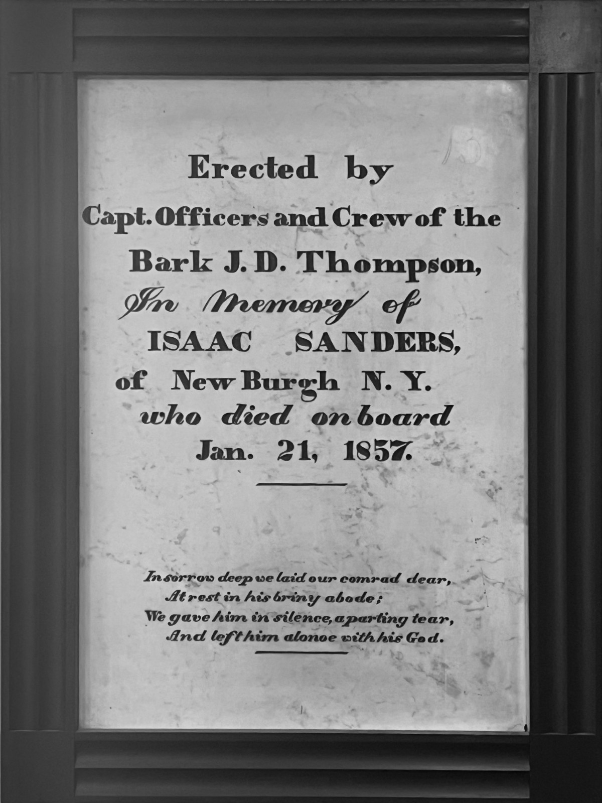 We’d like to pay tribute to Isaac Sanders from New Burgh, New York. Isaac was a valued steersman who ventured on the Bark J. D. Thompson in 1857. Unlike modern times, common ailments were more prevalent back then which led to serious health conditions and even death. It was on January 20th of that year that Isaac had developed a horrid case of small pox and unfortunately within the following day he had succumbed to his illness. Wanting to pay their respects to Isaac, the crew had decided to bury him at sea and a cenotaph was made in his name shortly after.