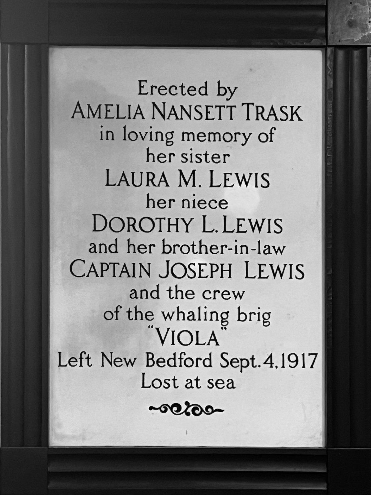 We not only learn more about the privileges whaling captains possessed but also commemorate the Lewis family and the crew of the Viola who perished far too soon. It was on September 4th, 1917 that Captain Joseph Lewis embarked on a whaling voyage with his wife Laura M. Lewis and his four year old daughter, Dorothy L. Lewis. It was mainly whaling captains who were only allowed to bring their close families along as room and provisions were limited. About half of a year went by with no word of the vessel and Laura’s sister, Amelia Nansett Trask grew worried. The family had owned property, specifically 223 North St. in New Bedford and its occupants had not been home for its upkeep. Many had speculations as to what happened. The first theory was that the ship itself had capsized somewhere between New Bedford and Cape Verde. The second, more popular belief is that the Viola had been sunk by a German submarine. During this time, World War I was in full swing, causing terror and fear at every point. There were reports of German submarines in the same waters with the Viola however other whaling ships in that area seemed to not fear being attacked. Though it was never discerned what really occurred, Captain and Mrs. Lewis’s will was presented in Probate in January of 1919. Then seventeen years later in September of 1936, Amelia Trask reached out to the New Bedford Port Society requesting to memorialize her family. It was decided after a conference with Mrs. Trask the best way was to craft a custom cenotaph which was later dedicated on February 21st, 1937 and resides in the Whaleman’s Chapel today.