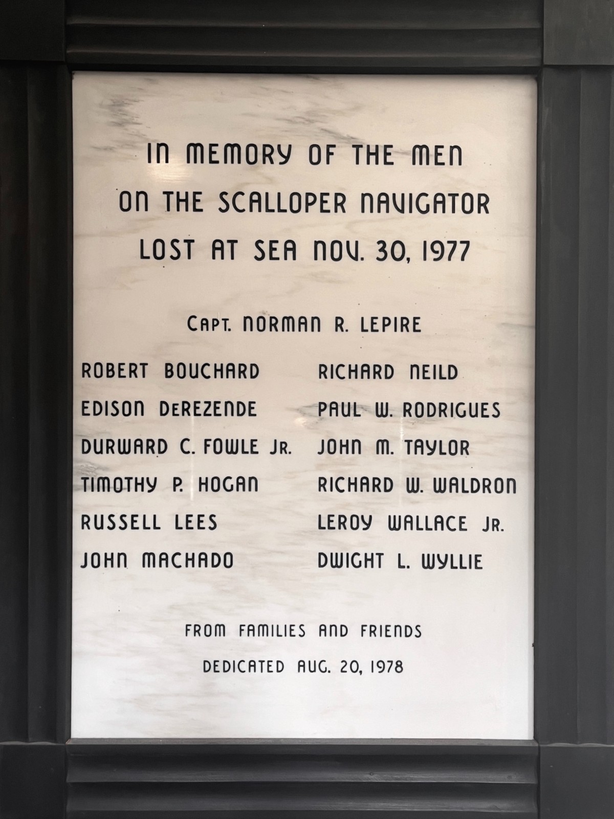 We pay tribute to those lost among the scalloper Navigator. On November 30th, 1977, twelve brave souls left the New Bedford harbor to the waters east of Nantucket. After the vessel went missing, the Coast Guard searched for any sign of the crew or ship. It was on January 8th, 1978 that an Italian fishing vessel discovered the remains of Richard W. Neild about ninety miles south of Martha’s Vineyard. Later that year, the New Bedford Port Society was able to memorialize the crew and Navigator, recognizing their courage and dedication to our community and beyond.