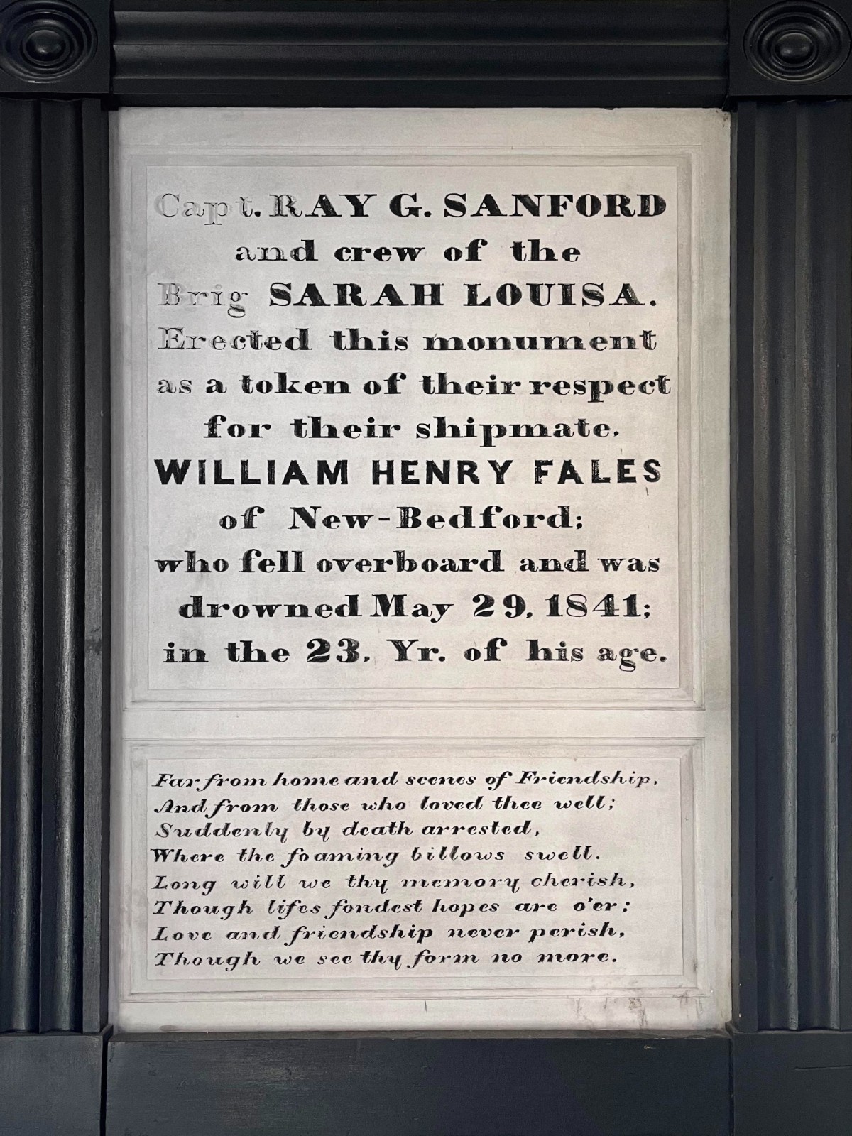 Their time on the open seas were proven to be like that of any other whaling vessel, facing sickness, hunger, and most of all an unforgiving amount of waves. It was on May 29th, 1841 that tragedy struck as William was unfortunately lost overboard and drowned. As William was not only a vital crewmate but friend also, grief spread amongst the vessel while they sailed. Finally at home, Captain Sanford and his crew visited the Seamen’s Bethel and together erected a cenotaph in William’s name. Though the loss of William Henry Fales was heartbreaking for the community, his memory still lives on and his contribution never forgotten.