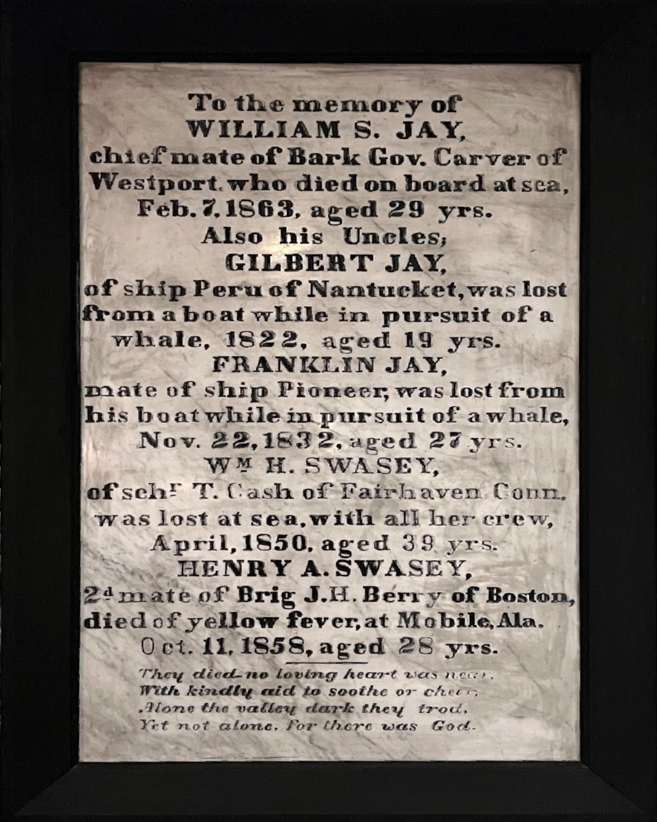 The first person we acknowledge is William S. Jay who was the 1st mate of the Bark Governor Carver. In 1860, his family had moved to New Bedford at 177 County Street and was surrounded by the fishing and whaling industry. Eventually he found himself on one of the countless ships leaving New Bedford’s harbor at the age of 29. Sadly after many months onboard due to the many hardships faced out at sea, William passed away on February 7th, 1863.